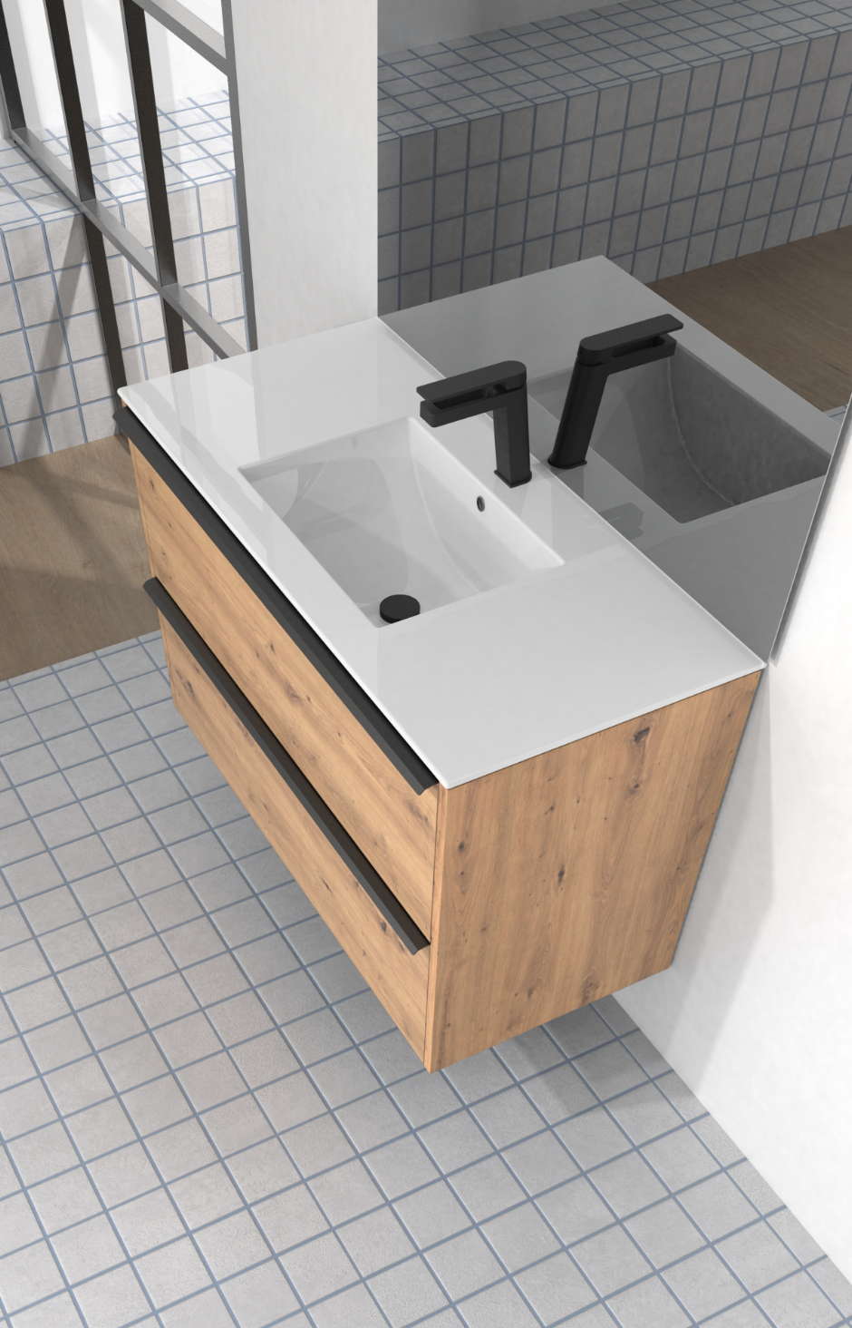 Mueble suspendido de 2 cajones o 3 cajones, mueble a suelo con patas negras en mate.